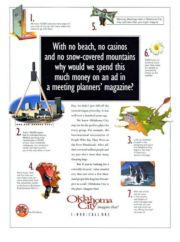 Logo for the Oklahoma City Convention and Visitors Bureau. Though many wanted the image to be more cosmopolitan than a boot-spur might indicate, we argued that the logo captured the authentic flavor of this windswept prairie and portrayed OKC as a vital, real-American hub city.
