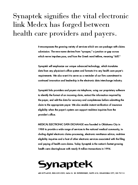 Named for synapses—the structures in the human nervous system that enable electrical or chemical communication between cells—this name, the mark and the next four panels are part of the work done in rebranding a health care clearinghouse formerly known as Medex. In part, as a result of this effort, the company's industry profile increased and they were purchased by the company eventually responsible for WebMD.